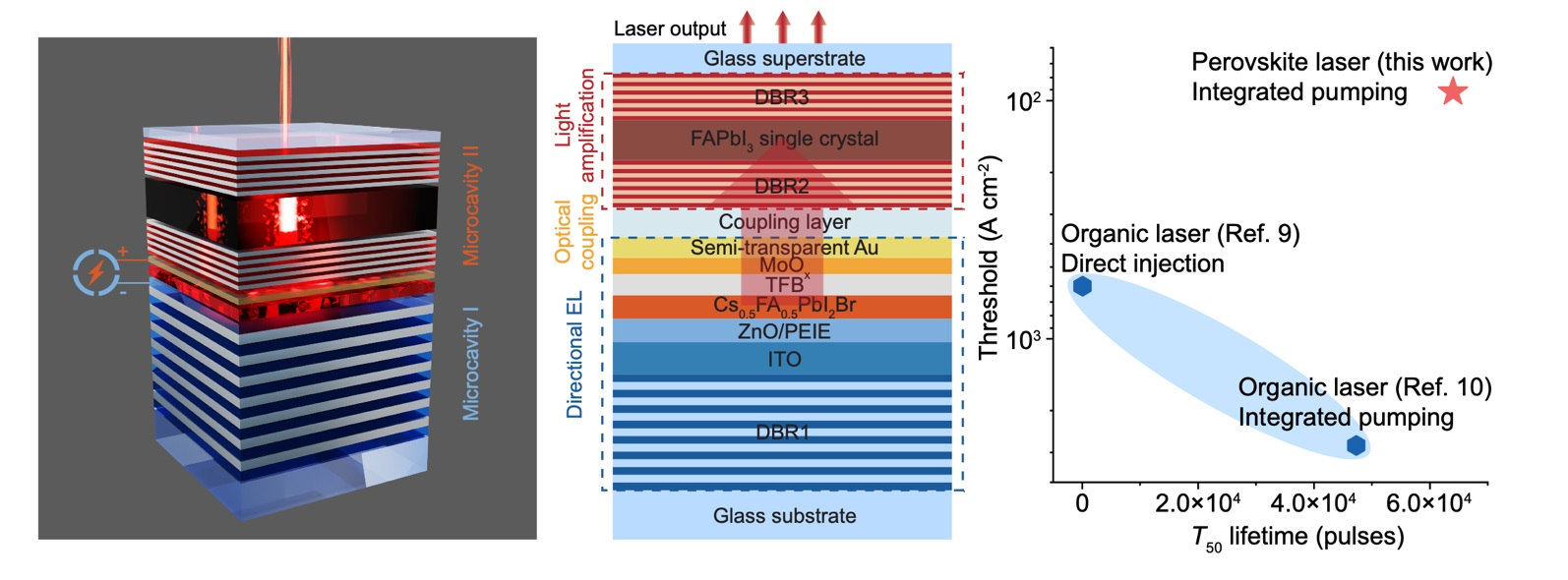 Полупроводниковые лазерыявляются важными источниками света в вычислительной технике. Перовскитные полупроводники — новый класс лазерных материалов с низкими эксплуатационными затратами и простой интеграцией в оптоэлектронные платформы на основе кремния. Их перестраиваемые спектры излучения позволяют лазерам с оптическим приводом достигать минимально возможного порога генерации, открывая значительные технологические возможности. Внешняя энергия, необходимая для управления лазерами, обычно предоставляется в двух формах: электрическая энергия и оптическая энергия. Однако оптический контроль обычно требует высококачественных внешних источников света, что ограничивает количество жизнеспособных устройств. Разработка перовскитных лазеров с электрическим приводом является фундаментальной задачей перовскитной оптоэлектроники.
